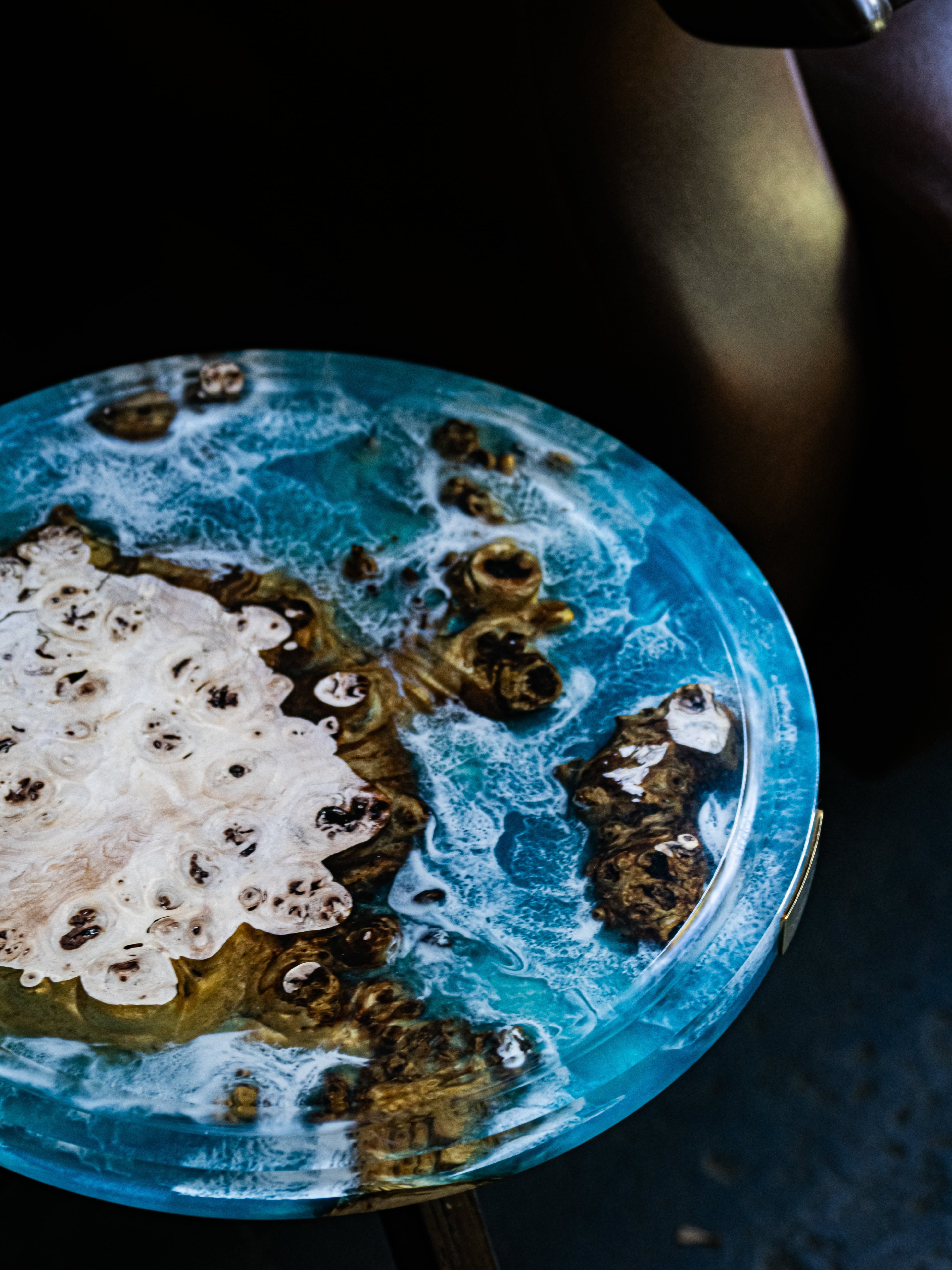 自然の景色をそのまま天板に映し出したような、ウッドレジンの三脚天板。流れるような青と、個性的な木の表情が絶妙に調和し、ひとつとして同じもののないアートピースに仕上がっています。